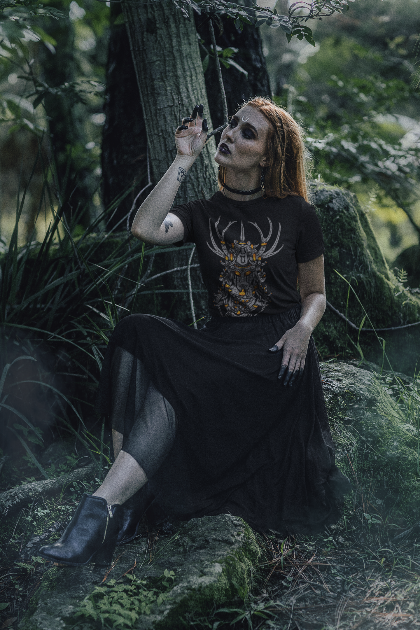 Embrace the allure of Norse mythology with this captivating Black Tee, featuring a sutble Grey design that pays homage to the goddess Freya. This unique piece showcases a detailed god mask of Freya, crowned with antlers symbolizing fertility. At the bottom of the design is the enchanting Brisingamen necklace, accompanied by one of Freya's magical cats.